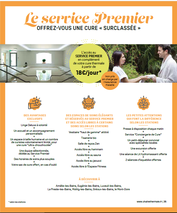 ► Consulter le détail des remises par hébergementEt 50 € de remise sur le supplément Service Premier dans le cadre d'une cure conventionnée*